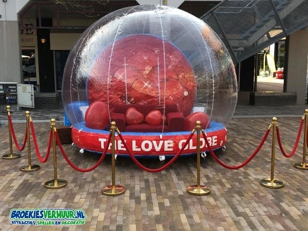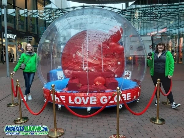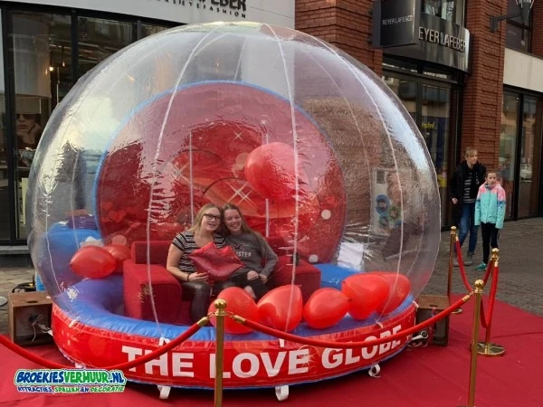 Vanaf heden is dit kleine sneeuwbolletje in een groot formaat te huren in een opblaasbare vorm, genoemd The Love Globe. Een levensgrote Snowglobe waarin het spontaan begint te sneeuwen op het moment dat u ook maar 1 stap in deze snowglobe zet.