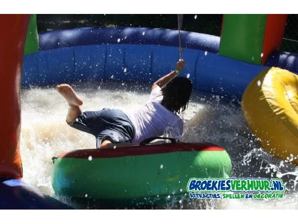 Een super Water competitie Attractie, Loop naar de baan, klim via de touwladder omhoog, ga in het bootje zitten en glij naar de bel boven in het zwembad.