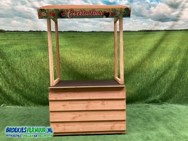 Hoe leuk is dat, een uitdeelkraam in het thema Cocktail, deze kraam is natuurlijk prima inzetbaar tijdens uw Zomerfeest of Beach Party. Deze houten promotiekraam is voorzien van een leuk themabord.