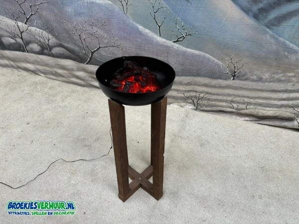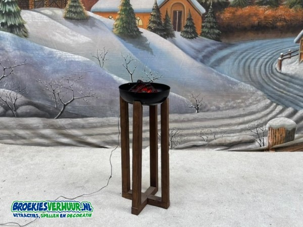 Deze vuurschaal op houten frame wordt compleet met vlamverlichting geleverd. De vlamverlichting werkt op 220 volt.