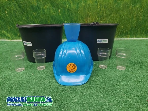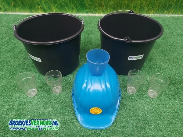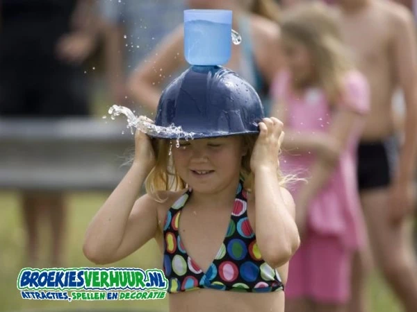 Zet de helm met beker op je hoofd en breng zoveel mogelijk water naar de overkant van het parcours.