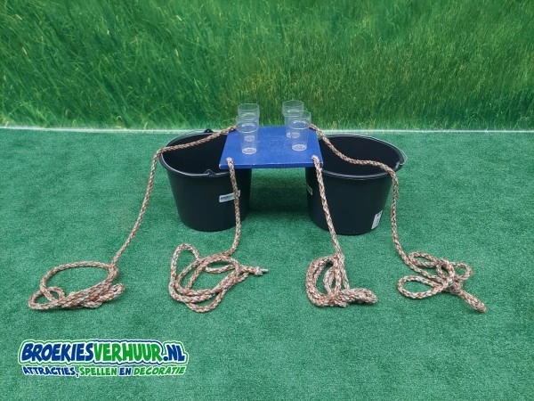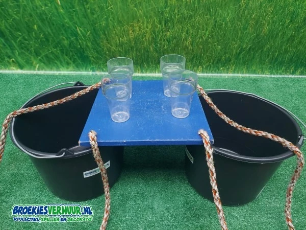 Weer een leuk spel voor een goede samenwerking. Plaats de kleine emmer met water op de plank, en pak met twee mensen de touwen vast. Zo zal de plank met emmer gaan zweven tussen de twee deelnemers in. Leg het uitgezette parcours af en probeer zoveel mogelijk water over te brengen.