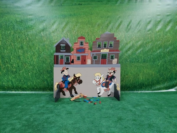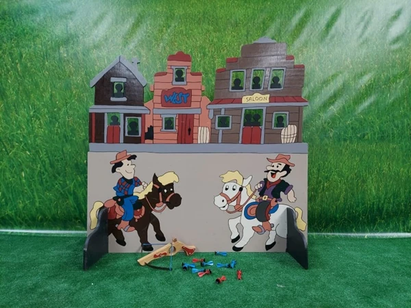 Western Schiet Spel, probeer zoveel mogelijk poppetjes in het mooie spel omver te schieten met de meegeleverde pistool en pijltjes.