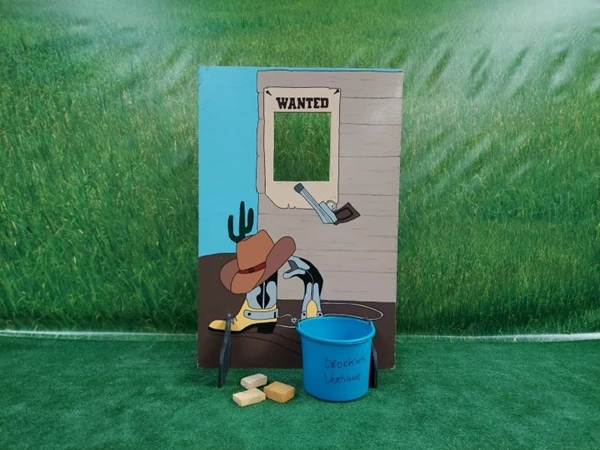 WesterSpons Gooien, laat iemand zijn of haar hoofd door het gat in het spelbord steken, terwijl de tegenstanders proberen het hoofd te raken met de meegeleverde sponsen.
