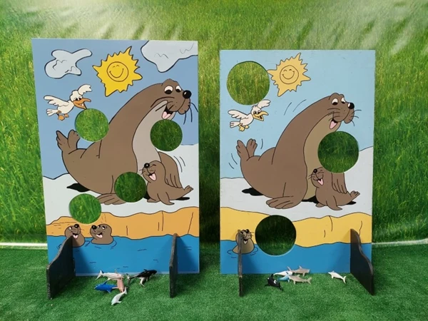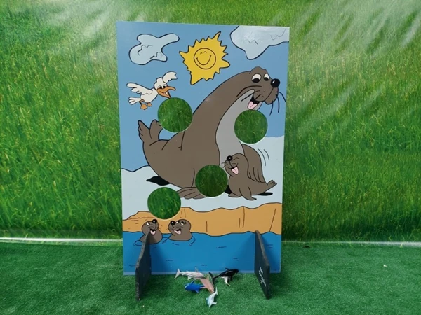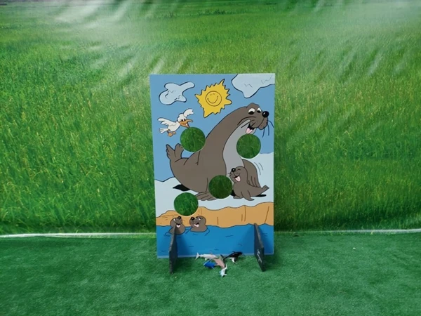 Zeehond Voeren, probeer zoveel mogenlijk vissen door de gaten in het spelbord te gooien.